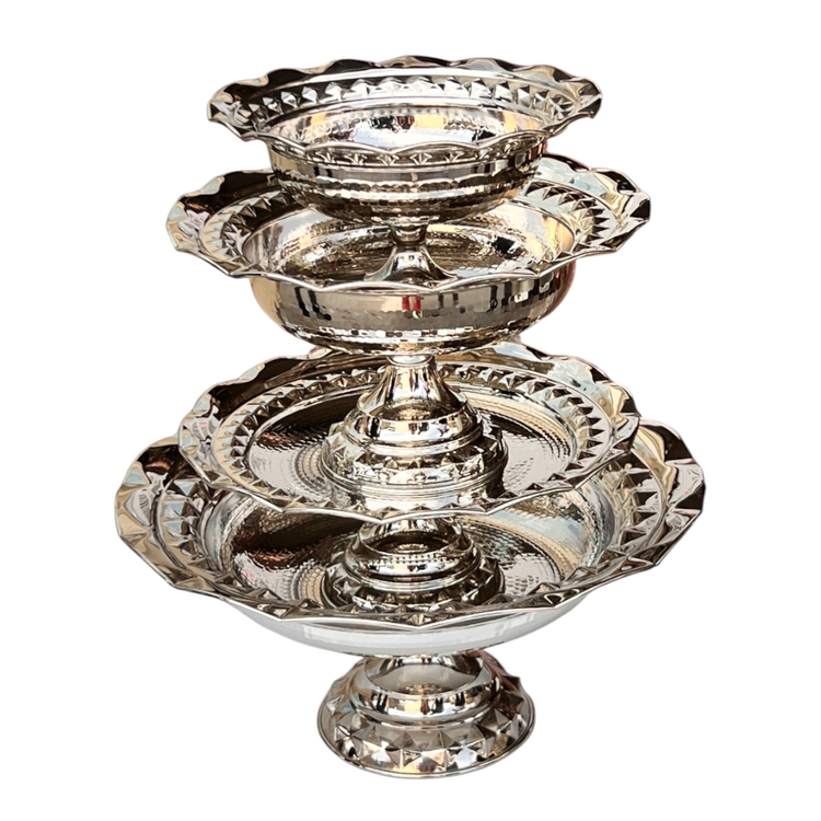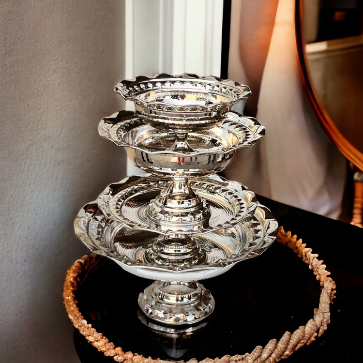 ست پذیرایی مسی با طراحی سهبعدی و روکش کروم براق، انتخابی ایدهآل برای میزهای رسمی و مراسم خاص است. این مجموعه که تلفیقی از هنر مسگری ایرانی و تکنولوژی روز است، زیبایی خیرهکنندهای به میز پذیرایی شما میبخشد.