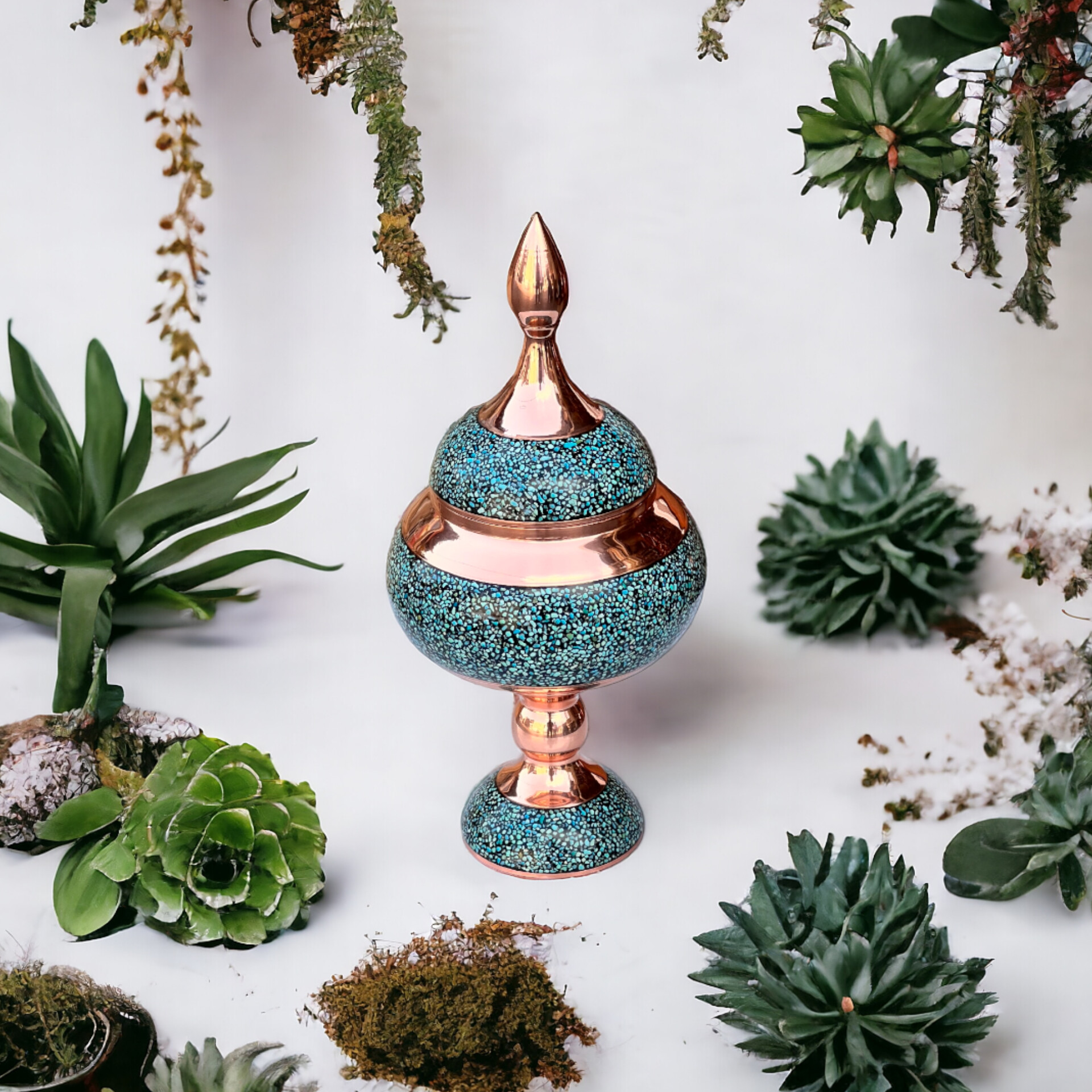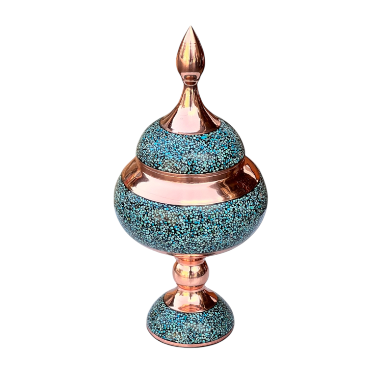 ظرفی از جنس مس با تزئینات فیروزهکوبی دستساز، مناسب برای پذیراییهای رسمی و مراسم خاص. این اثر هنری که با مهارت استادکاران اصفهانی ساخته شده، زیبایی و اصالت را در کنار هم ارائه میدهد.