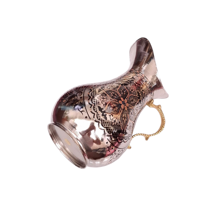 پارچی از جنس مس، اثری نفیس برای سرو نوشیدنیهای سرد. این پارچ با طراحی منحصربهفرد خود، زیبایی خیرهکنندهای به میزهای رسمی میبخشد.