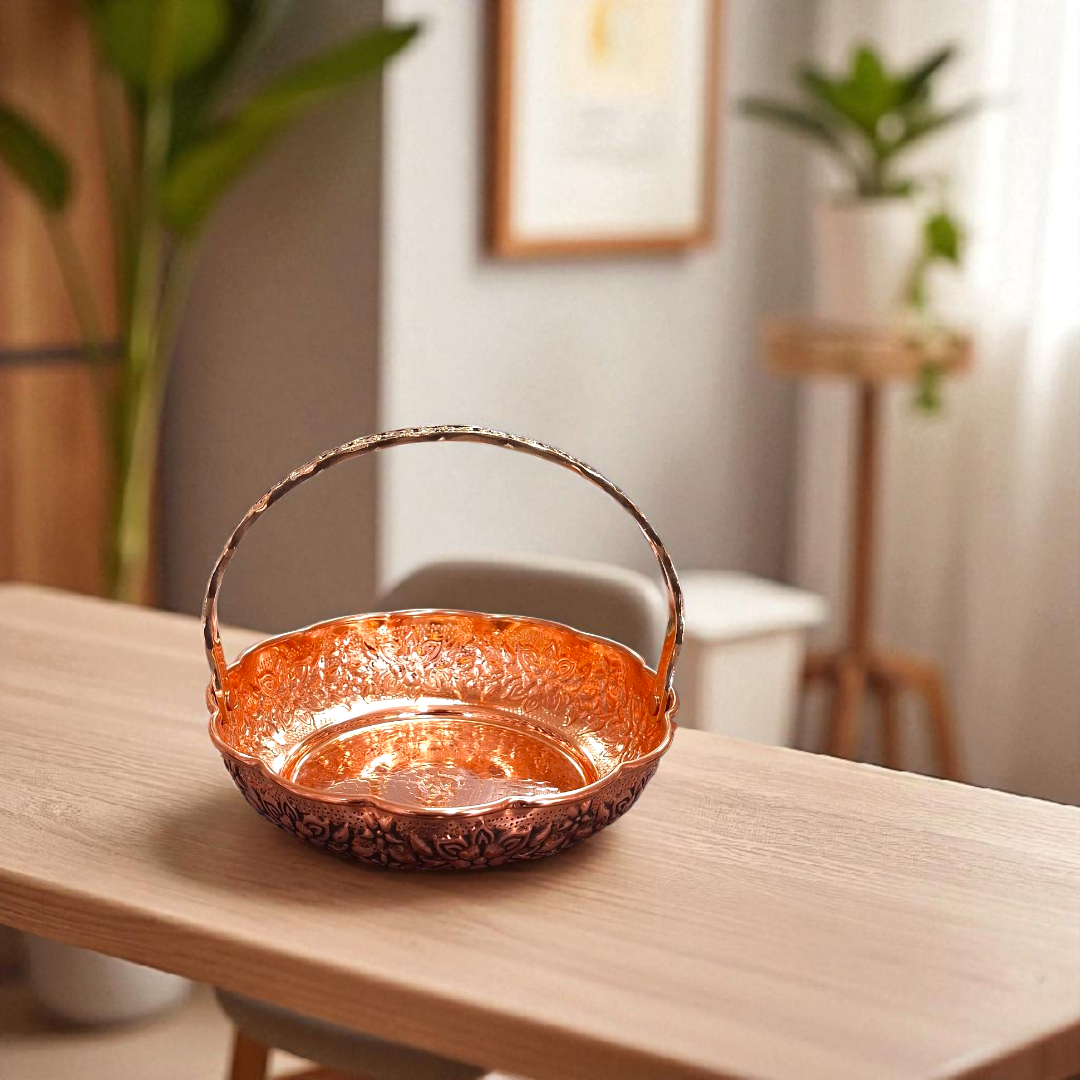 سبدی از جنس مس با طرح گلبرگهای ظریف و چکشکاری دستی، مناسب برای سرو نان، میوه یا تزیین فضای خانه. هر گلبرگ این اثر، نشاندهندهی مهارت صنعتگران ایرانی است.