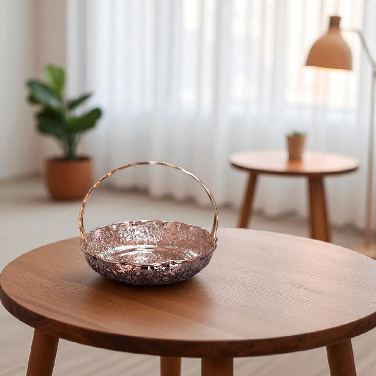 سبدی از جنس مس با روکش کروم براق و طرح گلبرگهای ظریف، تلفیقی از هنر سنتی و مدرنیته را ارائه میدهد. این اثر که با چکشکاری دقیق ایجاد شده، هم کاربردی است و هم جلوهای ویژه به میز پذیرایی میبخشد.