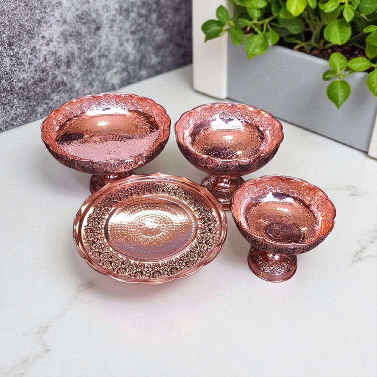 مجموعهای کامل از ظروف مسی با نقش گلبرگهای ظریف و چکشکاری دستی، مناسب برای میزهای رسمی و مراسم . هر قطعه از این ست، هنر مسگران زنجانی را در مهمانیهای شما زنده میکند.