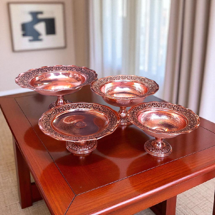 مجموعهای نفیس از ظروف مسی با طرح گلهای ریز و ظریف در حاشیه، ساختهشده به روش چکشکاری سنتی. این ست که با هنرمندی استادکاران زنجانی خلق شده، زیبایی اصیل ایرانی را به میزهای رسمی میآورد.