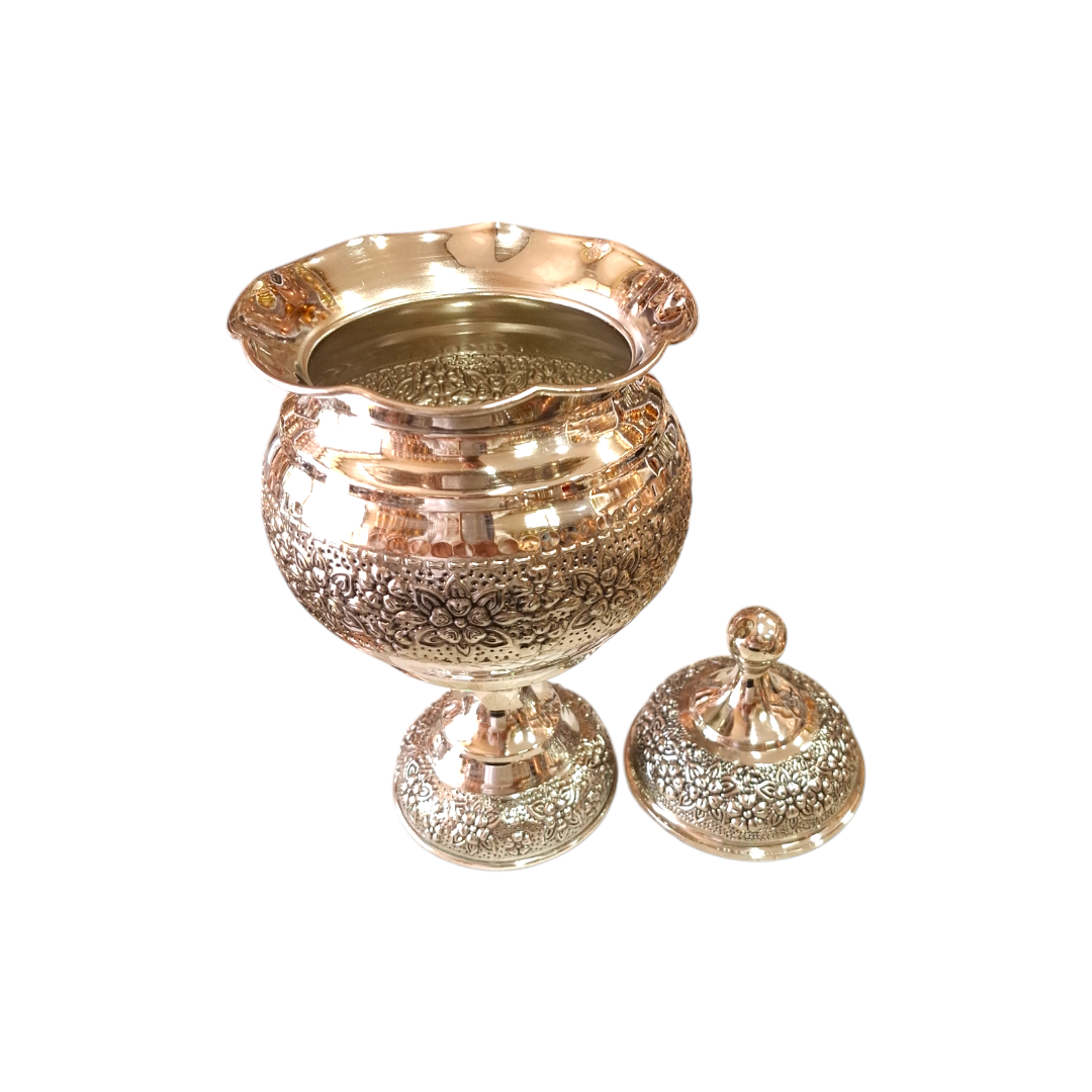ظرفی از جنس مس با پایهای ظریف و طرح گلبرگهای چکشکاریشده، مناسب برای سرو شکلات در مهمانیهاو مراسم ها. این اثر که با هنرمندی مسگران زنجانی ساخته شده، زیبایی و کاربردی را یکجا ارائه میدهد.