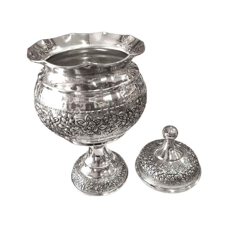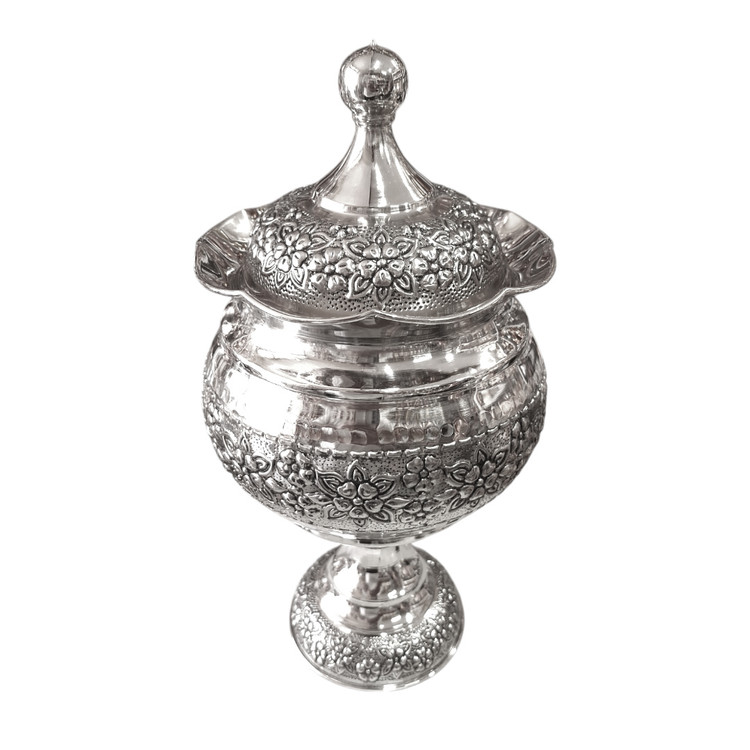 ظرفی از جنس مس با پایهای ظریف، طرح گلبرگهای چکشکاریشده و روکش کروم براق، مناسب برای سرو آجیل در مراسم رسمی و مهمانیهای مجلل. این اثر که با تلفیق هنر سنتی و پرداخت مدرن ساخته شده، زیبایی خیرهکنندهای به میز پذیرایی میبخشد.