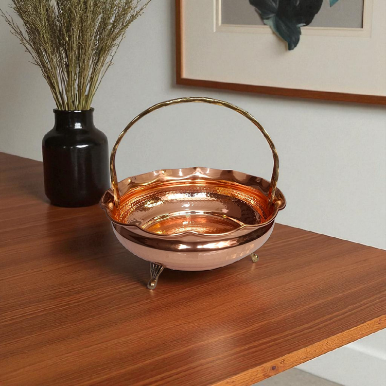 سبدی از جنس مس با سه پایهی ظریف و چکشکاری دستی، مناسب برای سرو نان، میوه یا تزیین فضای پذیرایی. این اثر که با هنر مسگران زنجانی ساخته شده، ترکیبی از زیبایی و کاربردی را ارائه میدهد.