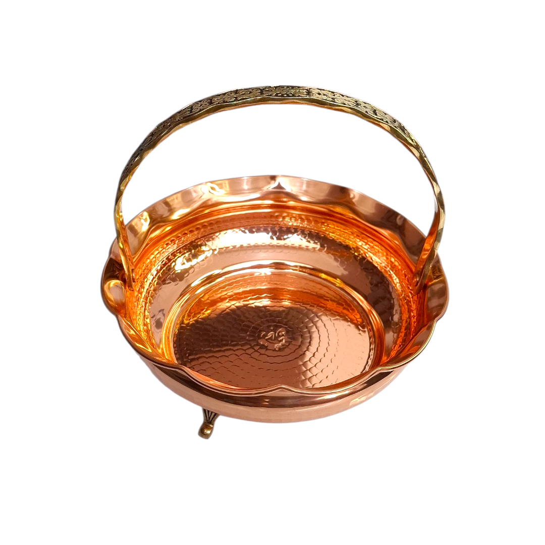 سبدی از جنس مس با سه پایهی ظریف و چکشکاری دستی، مناسب برای سرو نان، میوه یا تزیین فضای پذیرایی. این اثر که با هنر مسگران زنجانی ساخته شده، ترکیبی از زیبایی و کاربردی را ارائه میدهد.