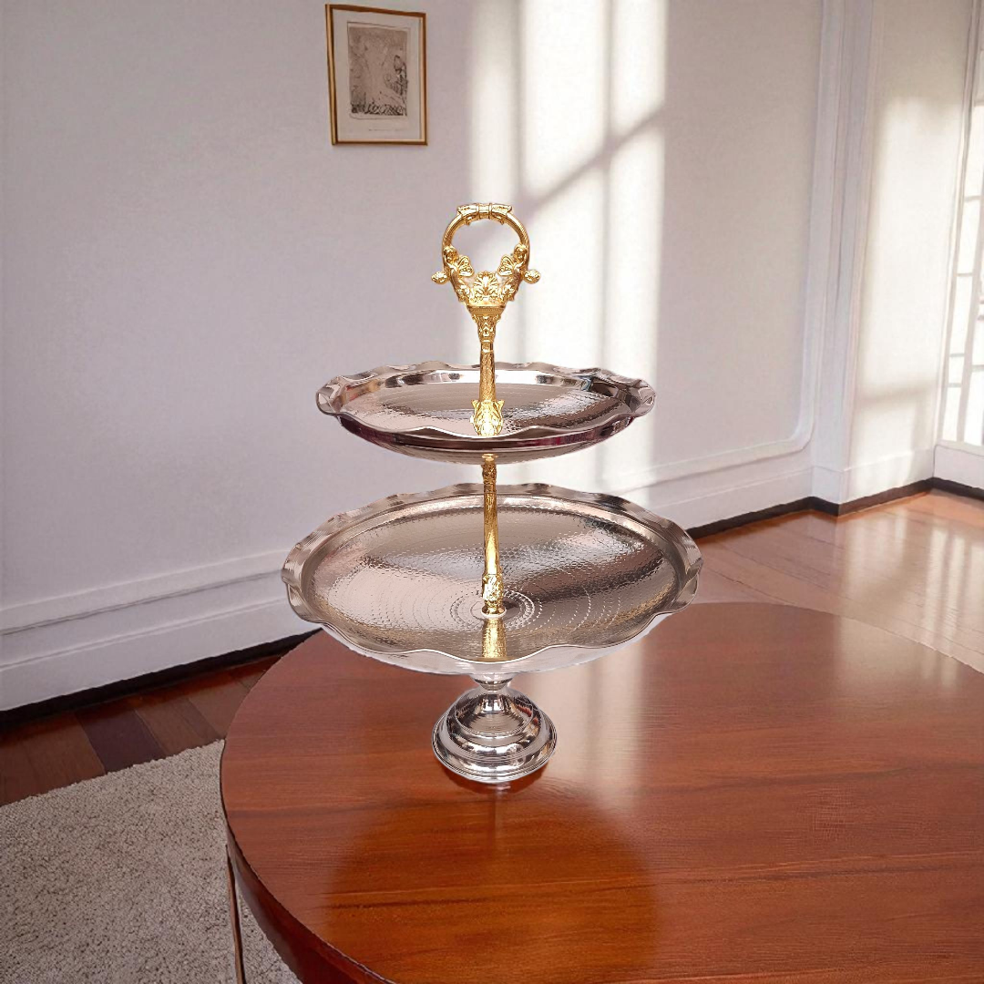 ساختاری دوطبقه از جنس مس با روکش کروم براق، مناسب برای چیدمان شیرینی در مراسم رسمی و مهمانیهای مجلل. این اثر که با تلفیق هنر مسگری و طراحی مدرن ساخته شده، زیبایی خیرهکنندهای به میز پذیرایی میبخشد.