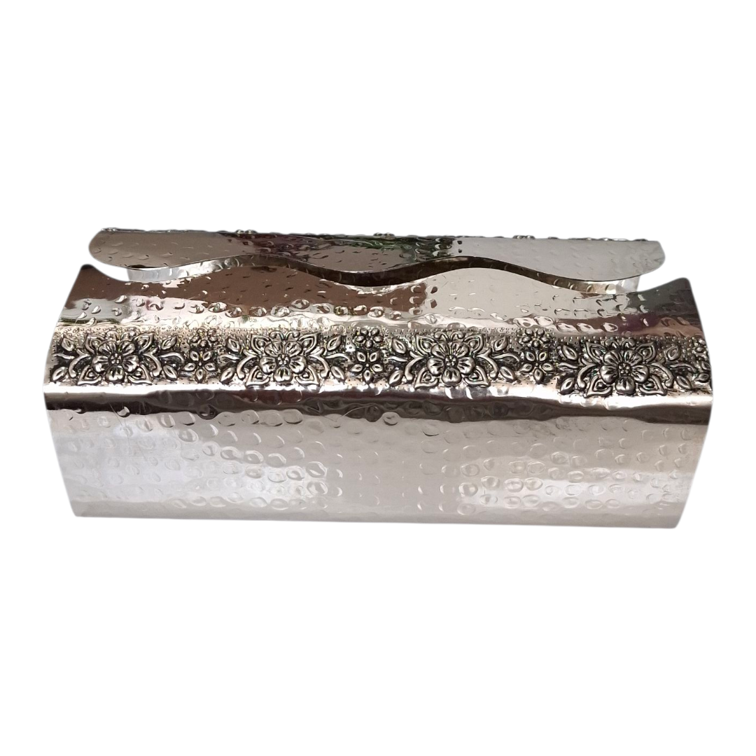 محفظهای از جنس مس با طرح گلبرگهای ظریف و روکش کروم براق، مناسب برای میزهای پذیرایی رسمی و فضاهای لوکس. این اثر که با تلفیق هنر سنتی و پرداخت مدرن ساخته شده، زیبایی و عملکرد را یکجا ارائه میدهد.