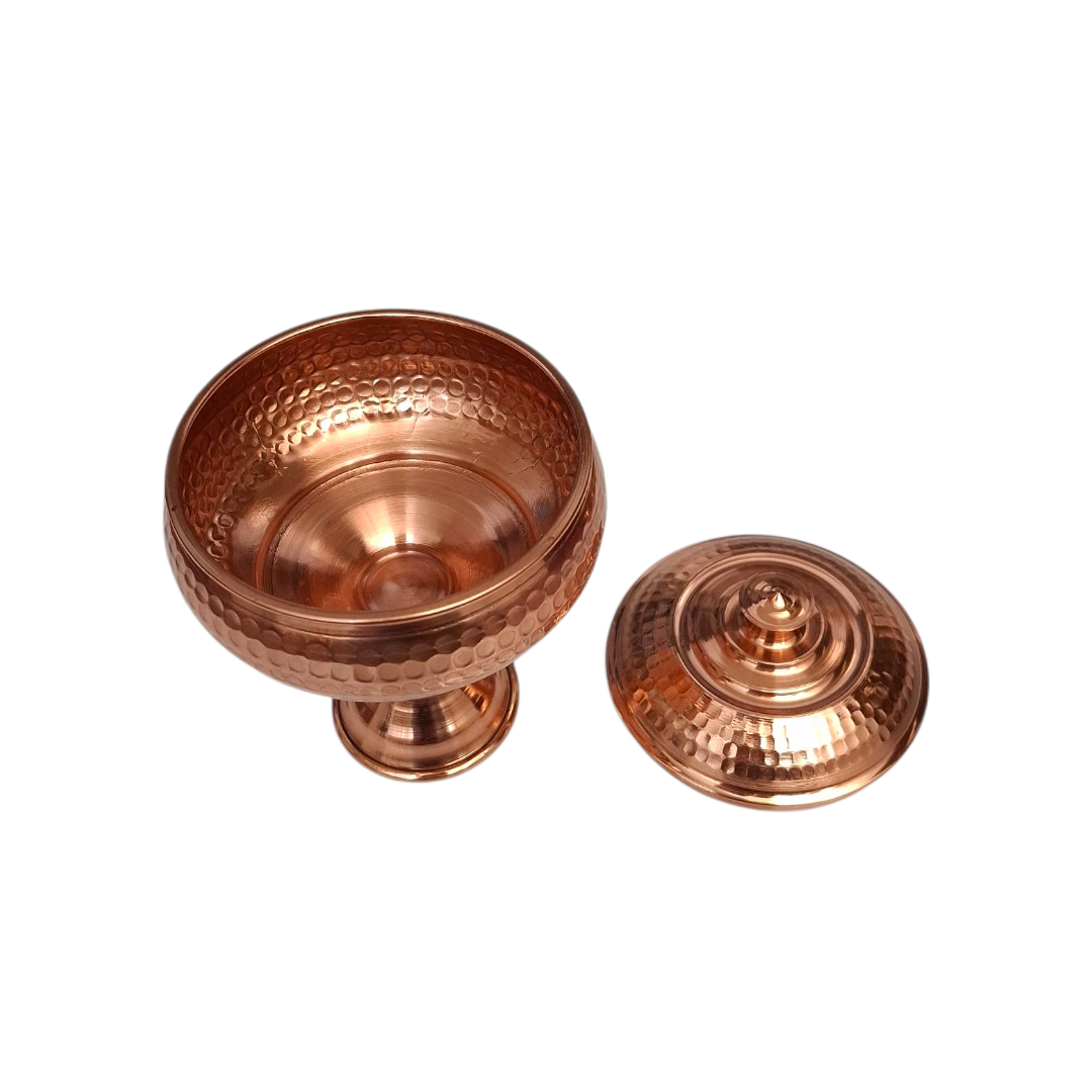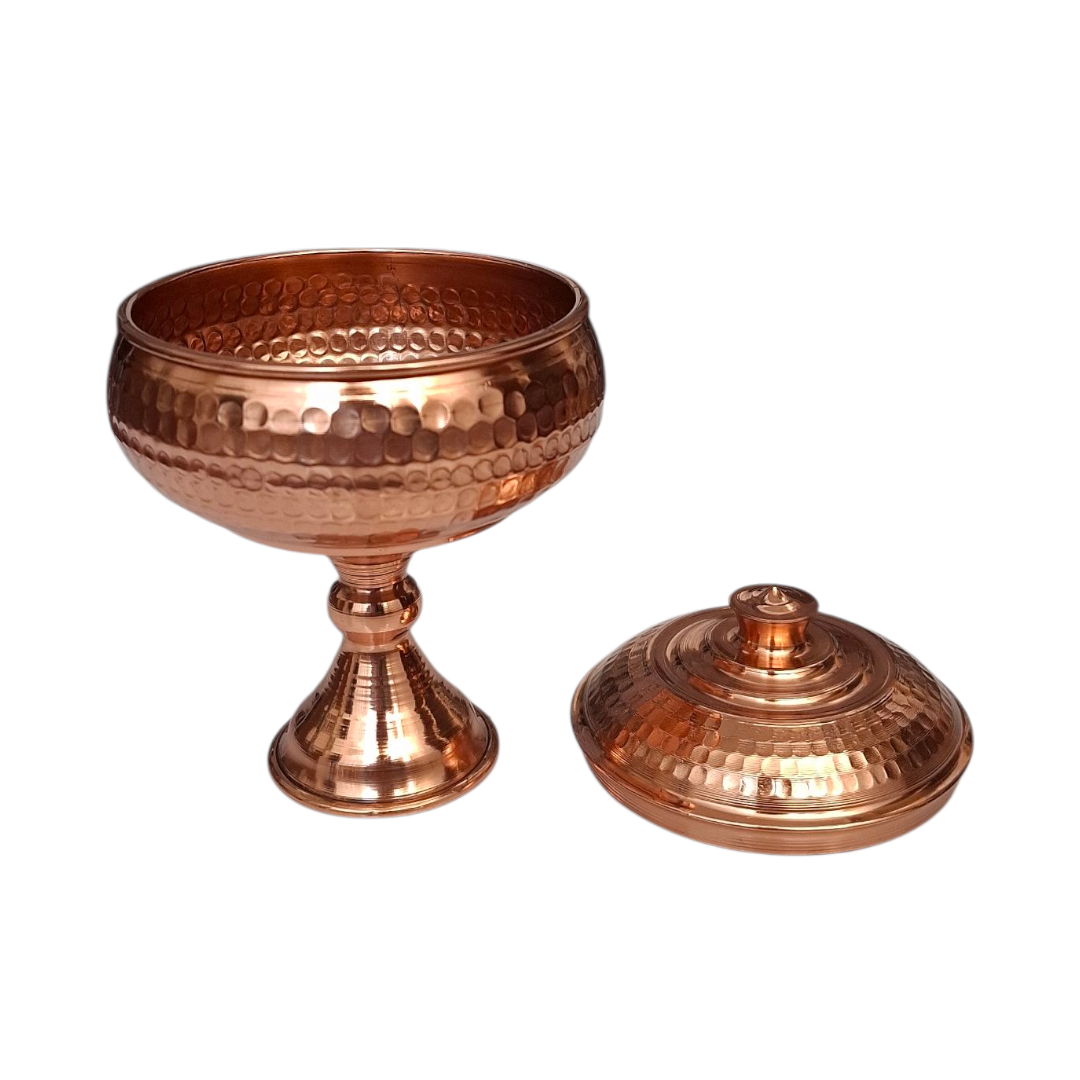 قندانی از جنس مس با طراحی سفینهای و پایهای ظریف، ساختهشده به روش چکشکاری سنتی. این اثر که با هنر مسگران زنجانی خلق شده، ترکیبی از فرم مدرن و اصالت هنری را ارائه میدهد.